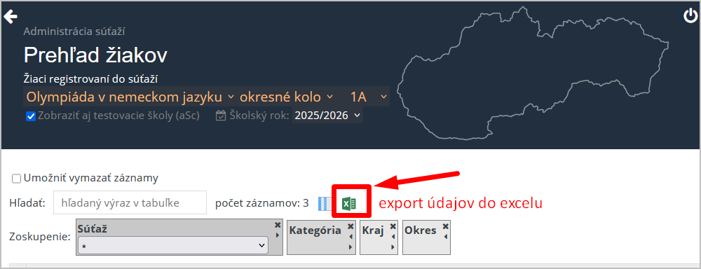 V prehľade žiakov nájdete aj meno a email na učiteľa, ktorý je kontakt pre organizátorov súťaže. Údaje si viete vyexportovať do excelu, odkiaľ jednoducho kontakty skopírujete pre účely zaslania pozvánky na ich emailové adresy.