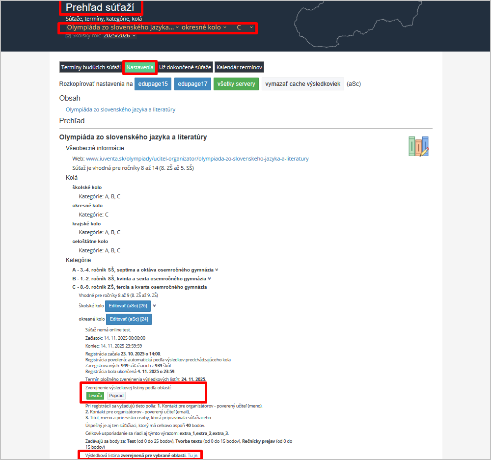 Vyberte Súťaž, kolo a kategóriu. Napríklad: