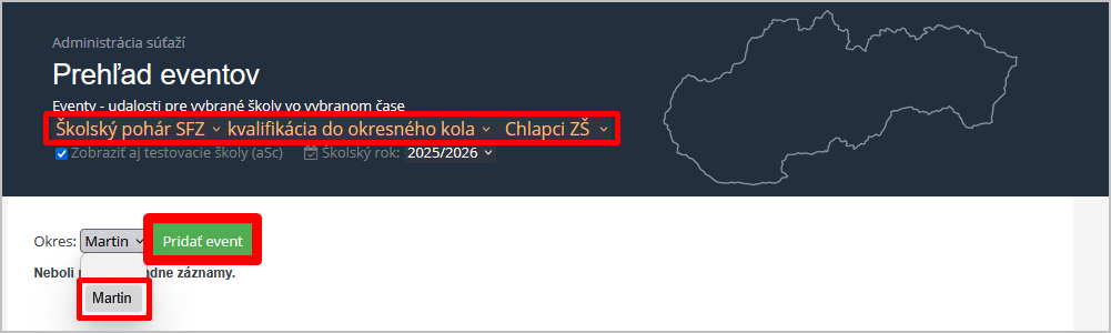 Následne je potrebné vybrať okres, v ktorom sa daná udalosť uskutoční (ak má organizátor právo na viacero okresov).