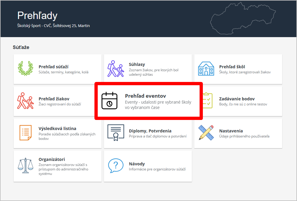 V prostredí pre administrátorov/organizátorov súťaží, v časti "Prehľad eventov":