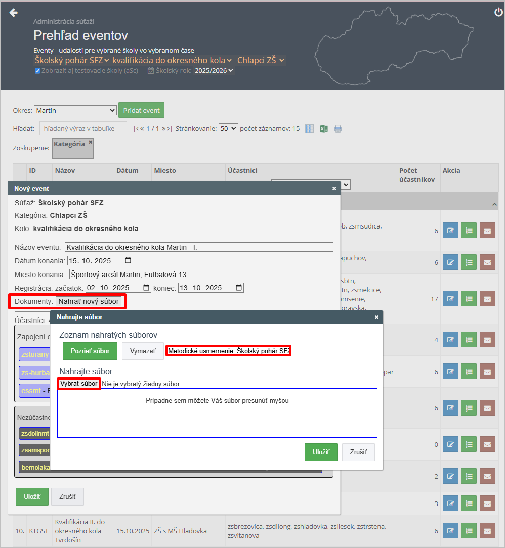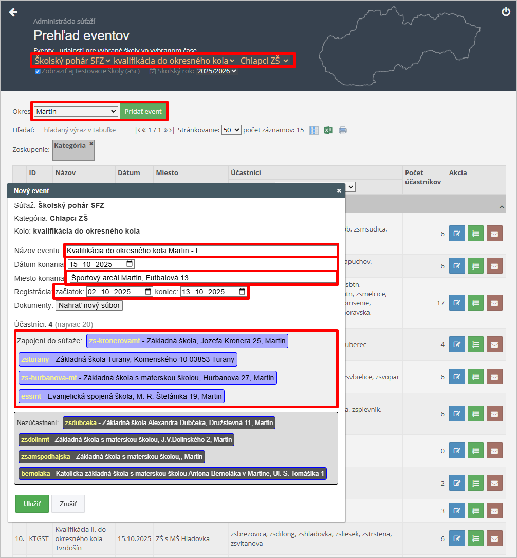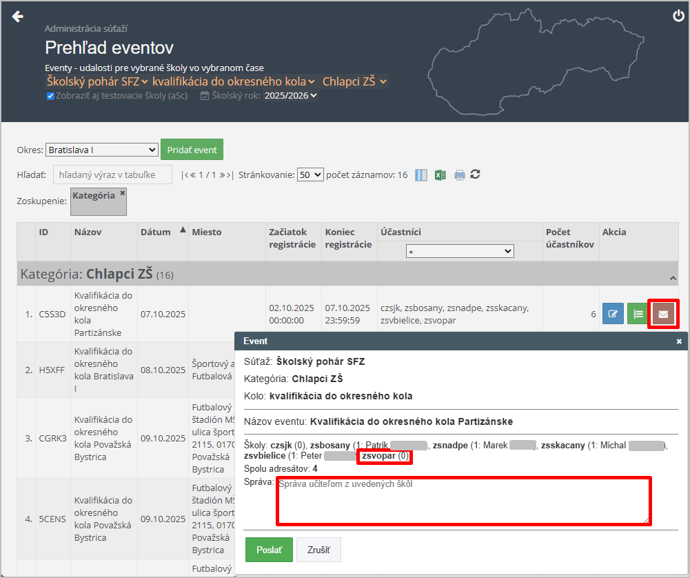 V správe je potrebné školy informovať, že event je pre nich už vytvorený a že je možné prihlásiť na súťaž konkrétnych žiakov, stiahnuť si súpisku, prezenčnú listinu.