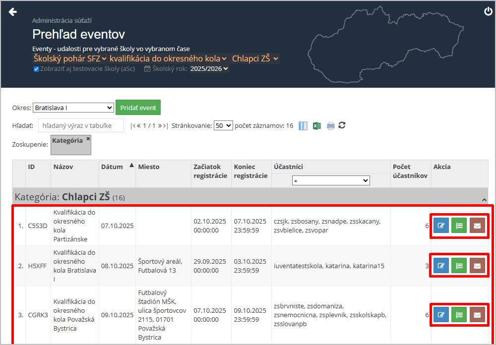 V prehľade eventov je zozam všetkých vytvorených udalostí/ eventov v danom okrese a kategórii.