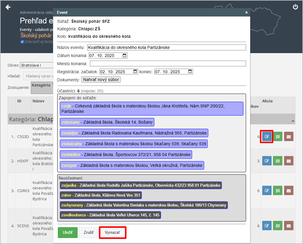 Pri chybne zadaných vlastnostiach udalosti ich viete upraviť (zmeny sa v krátkom čase prejavia aj v EduPAge daných škôl, prípadne je možné event aj vymazať.)