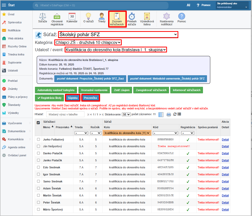 V časti Zoznam súťažiacich kliknite na "Súpiska" a "Prezenčka":