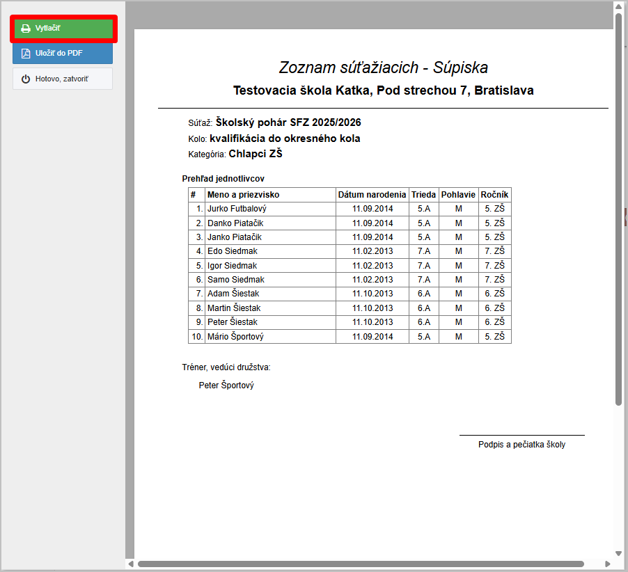 Po zaregistrovaní žiakov na školskú športovú súťaž Školský Pohár SFZ vygenerujete a vytlačte súpisku školského družstva a prezenčnú listinu.
