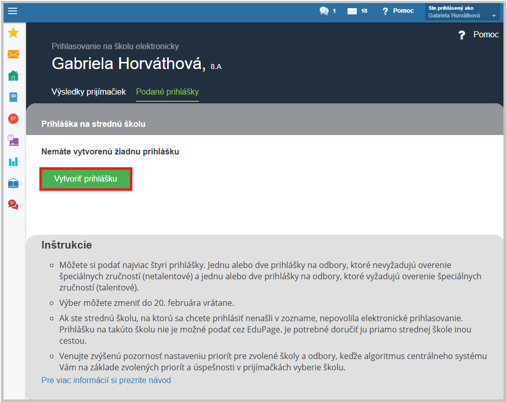 Novú prihlášku vytvoríte stlačením tlačidla Vytvoriť prihlášku.