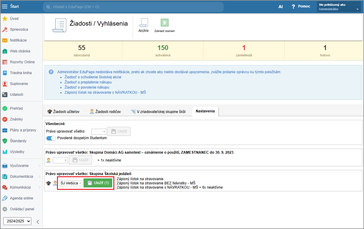 Administrátor môže spravovať všetky žiadosti.