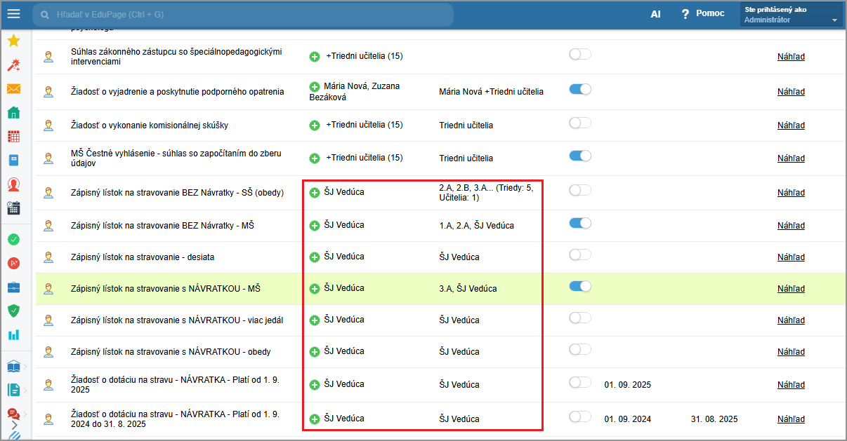 Triedny učiteľ môže spravovať žiadosti žiakov svojej triedy bez potrebného ďalšieho nastavenia. Toto právo má automaticky. Toto nastavenie je možné zmeniť.