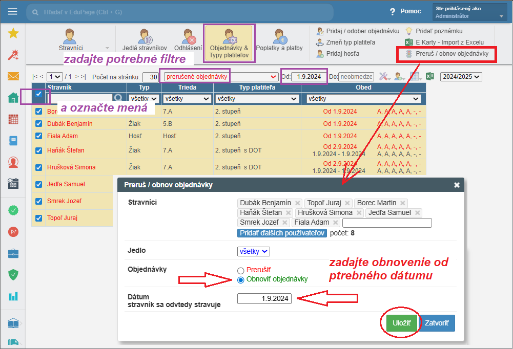 Stravníkov s prerušenými objednávkami môžete spolu s obdobím prerušenia vidieť v časti 'Objednávky & Typy platiteľov'.