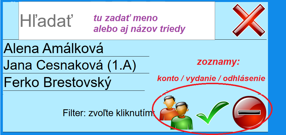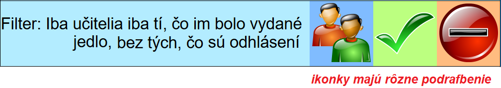 --- zoznamy stravníkov s určitým stavom - na výber sú tri ikonky a ich rôznou kombináciou si môžete dať zobraziť, čo potrebujete, napr. kto ešte nebol na obede
