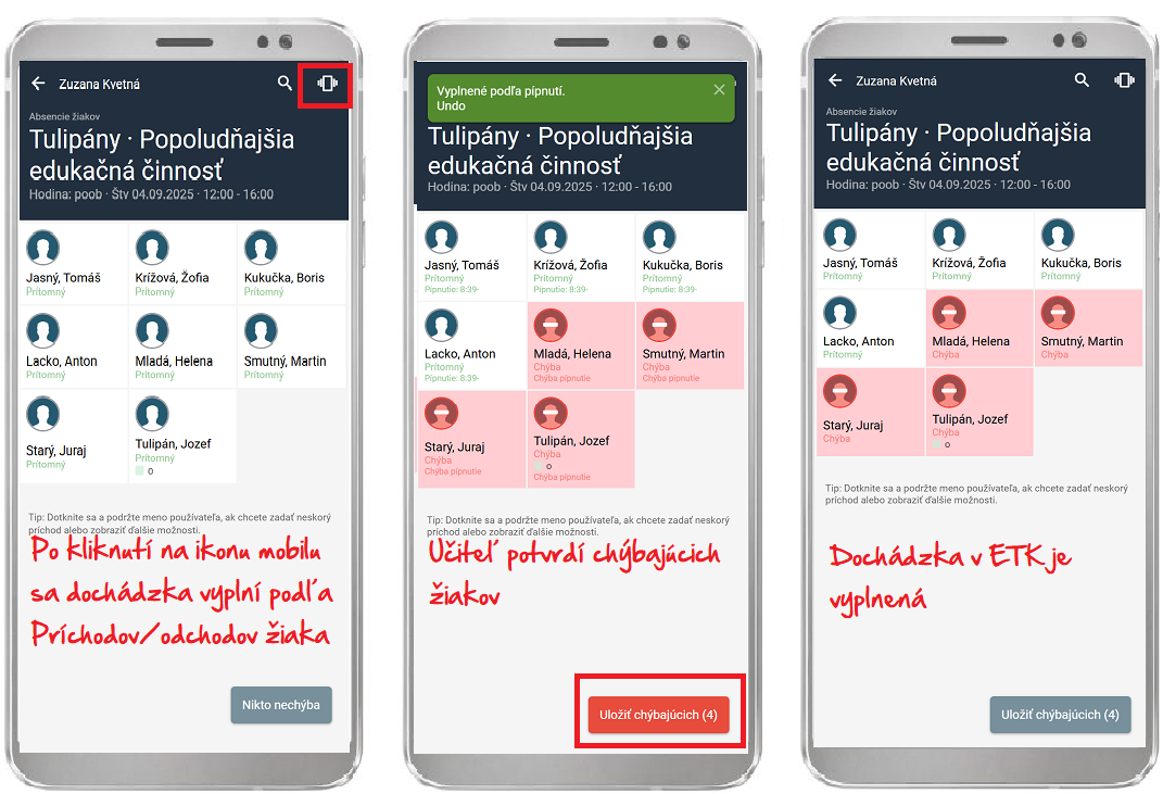 Kliknutím na ikonku v pravom hornom rohu prepojí dochádzku s modulom "Príchody/odchody žiaka". Chýbajúce deti potvrdí tlačidlom "Uložiť chýbajúcich".