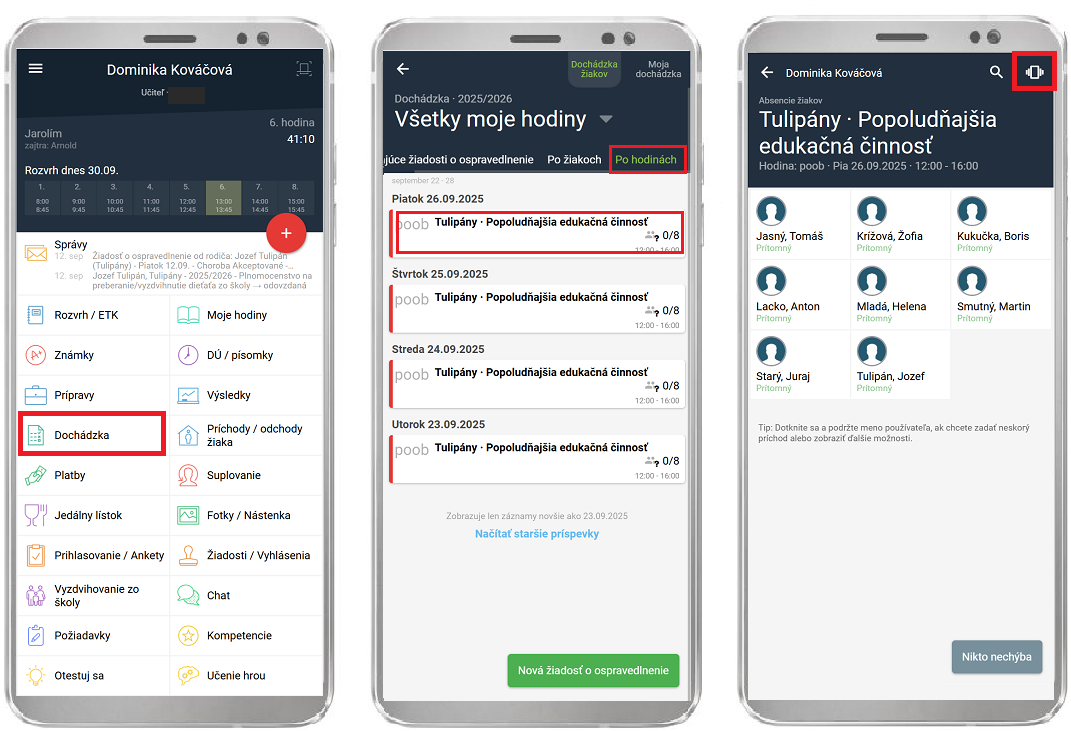V mobilnej aplikácií si učiteľ v module "Dochádzka" vyberie dochádzku "Po hodinách" a klikne na svoju hodinu.