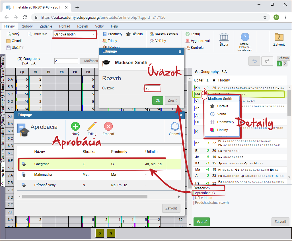 Kliknutím na "Aprobácia" môžete upravovať alebo vytvárať aprobácie v Edupage. Viac informácii o aprobáciach nájdete tu: Approbation - aSc Substitutions Online