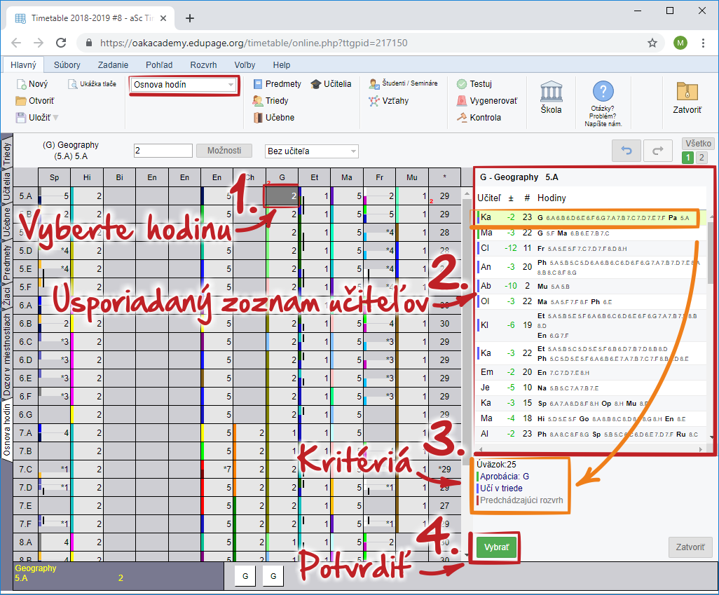 Zoznam učiteľov sa (pre)usporiada vždy po vybratí hodiny v osnove. Učitelia sú usporiadaný podľa kritérii (farebné prúžky vľavo) tak, že učiteľ na vrchu zoznamu je podľa programu najvhodnejši pre vybranú hodinu. Dvojklikom na riadok pridelíte učiteľa vybranej hodine.