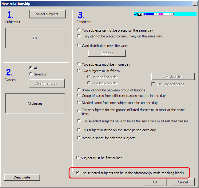 - you can also modify the time off for classes and subjects to pack the timetable into less periods, maybe in some cases this is easier than by adding the above relationship
