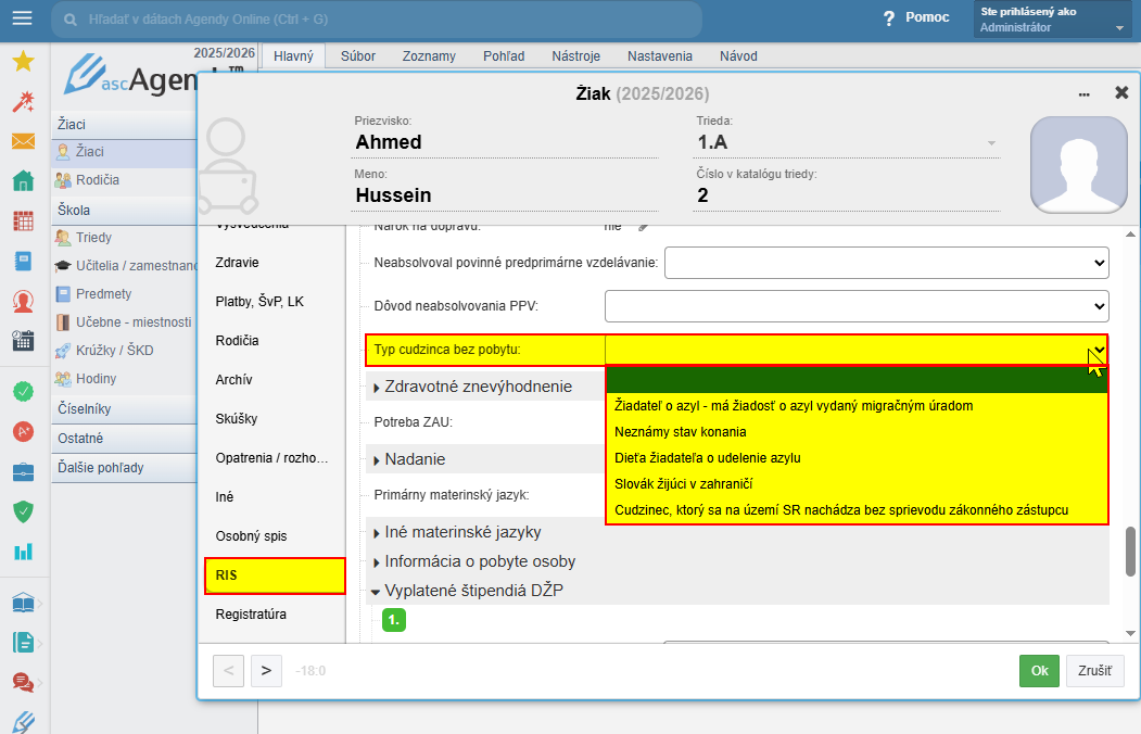 1. V karte žiaka v záložke Základné viete evidovať, či je daný žiak utečenec.