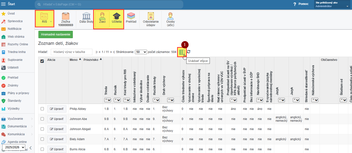 1. V module RIS kliknite na žiaci/učitelia. Zobrazí sa tabuľka s rôznymi stĺpcami a údajmi v nich. V riadkoch sú zobrazení žiaci/učitelia podľa abecedy. Aby ste si tabuľku mohli prispôsobiť vašej aktuálnej potrebe, kliknite na sivomodrú ikonu - Uvádzať stĺpce (1).