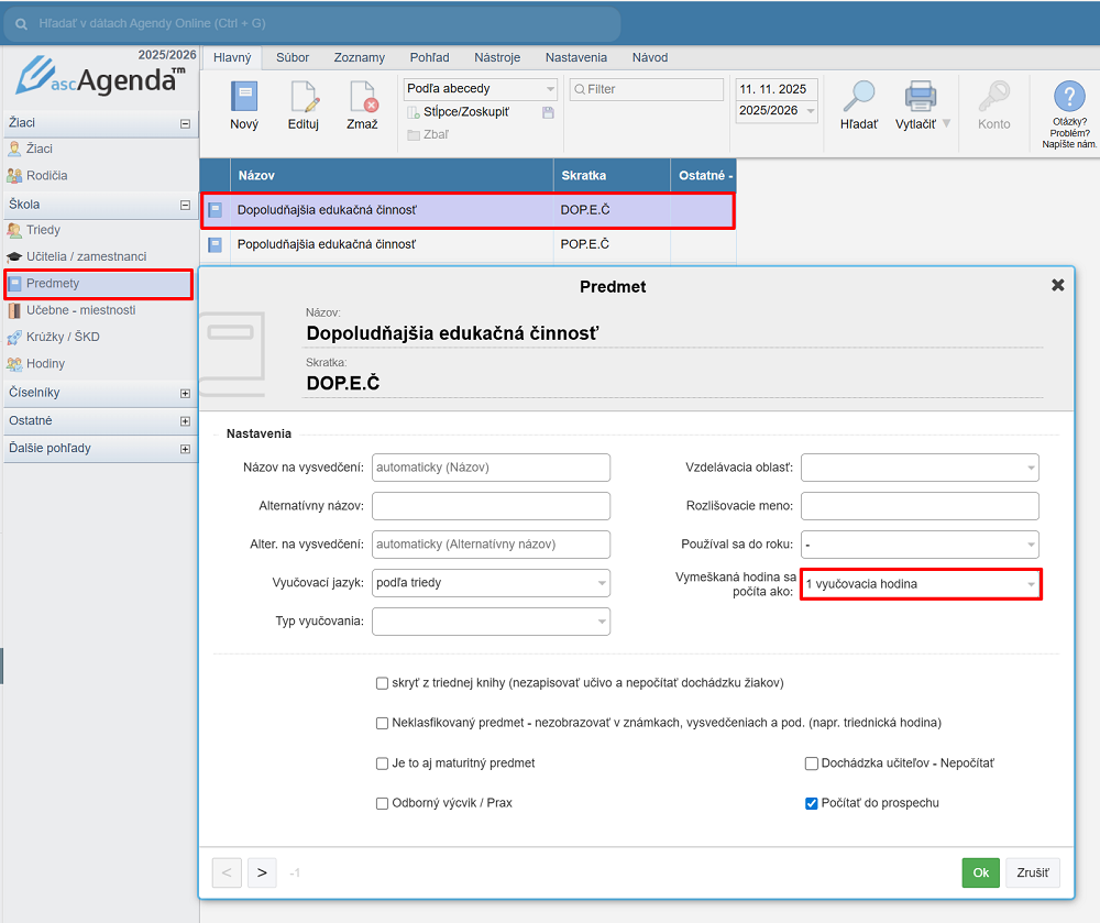 1. V nastavení Predmetu vybrať, aby sa vymeškaná hodina počítala ako 1 vyučovacia hodina.