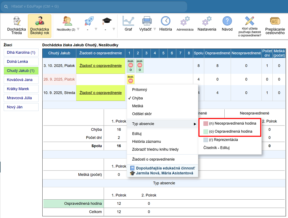 2. Je potrebné mať vyriešenú absenciu , teda hodinu označiť ako ospravedlnenú alebo neospravedlnenú .
