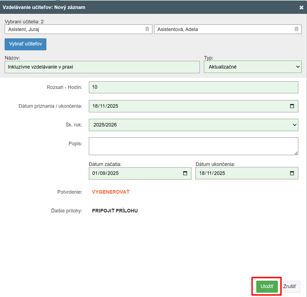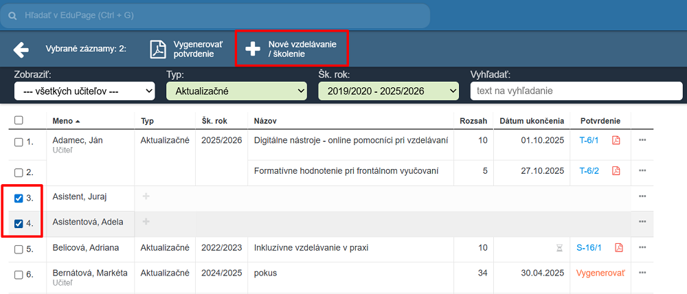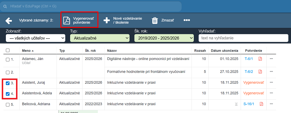 Potvrdenie o vzdelávaní môžete pripraviť aj viacerým učiteľom naraz. Zaškrtnite učiteľov, ktorí absolvovali rovnaké vzdelávanie.