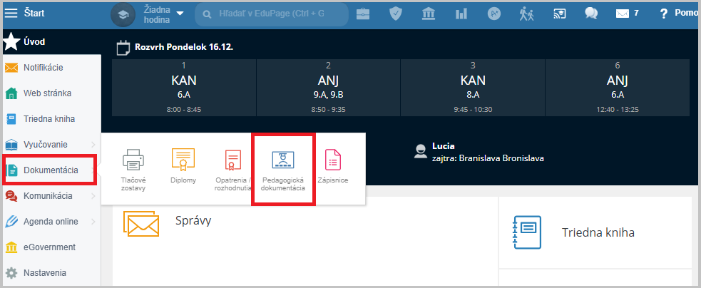 Vo svojom učiteľskom konte v ľavom menu vyberte záložku "Dokumentácia" a v nej možnosť "Pedagogická dokumentácia".