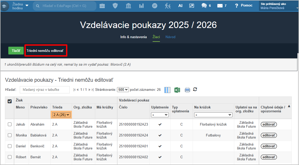 Administrátor EduPage však môže triednym učiteľom povoliť administráciu VP u žiakov vo svojej triede.