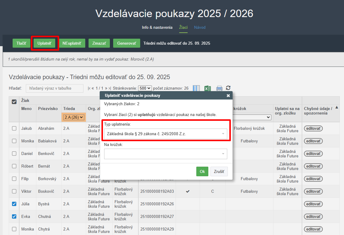 Uplatniť VP vie aj po jednotlivých žiakoch. Dvojklikom sa otvorí záznam žiaka. Tu sa zvolí uplatňuje a vyberie krúžok, na ktorý si žiak uplatňuje VP.
