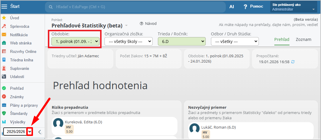 Ak si chcete zobraziť prehľadové štatistiky za iný školský rok, v ľavom dolnom rohu sa prepnite na iný školský rok a vyberte príslušné klasifikačné obdobie.