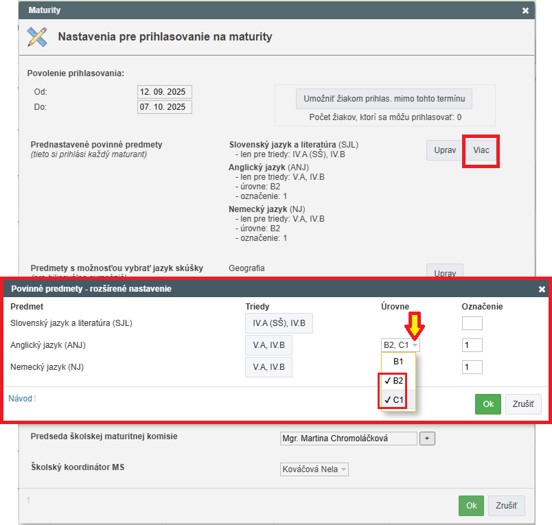 Skontrolujte, aké úrovne sú nastavené v module Maturita pre tento cudzí jazyk.