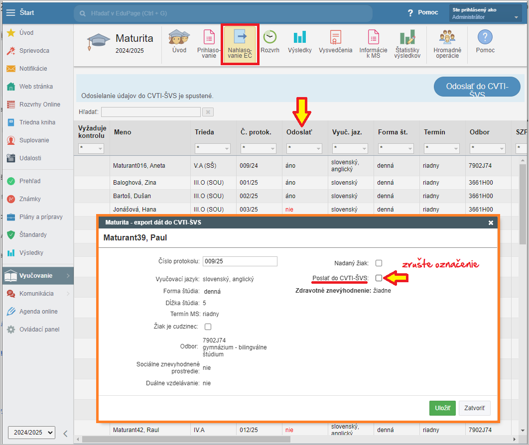 Kliknite na záznam prihláseného maturanta, ktorý sa nemá odoslať do CVTI ŠVS.