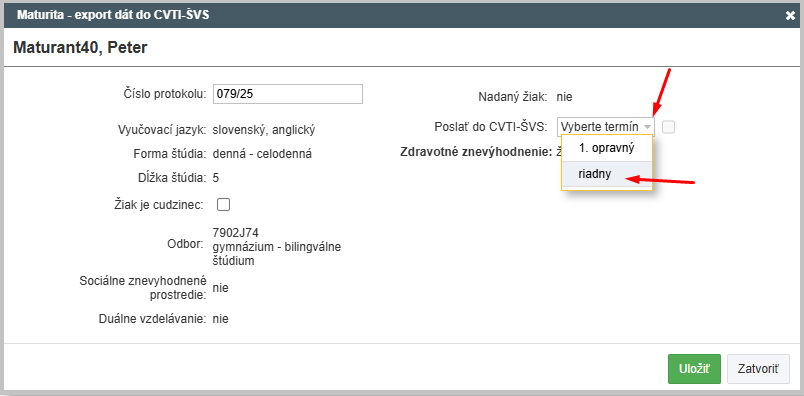 Vyberte termín "riadny" a zakliknite voľbu, aby sa do CVTI ŠVS odoslal.