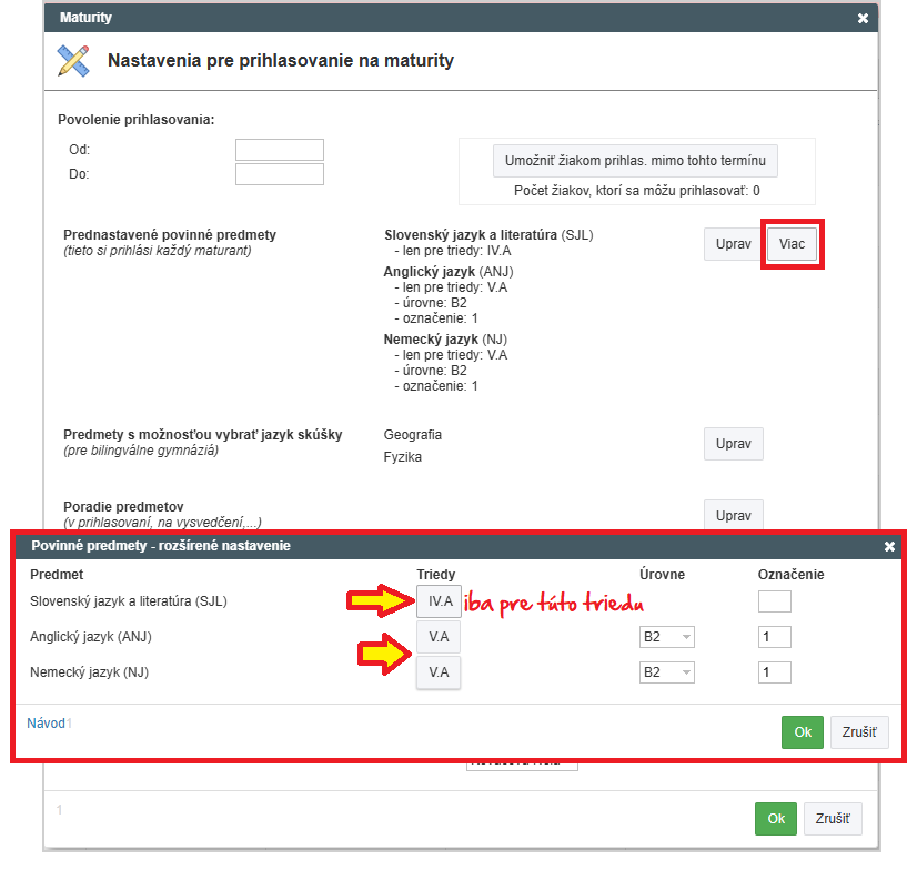 Toto viete pre bilingválne triedy nastaviť v module Maturita v časti Prihlasovanie - Nastavenia cez rozšírené voľby: