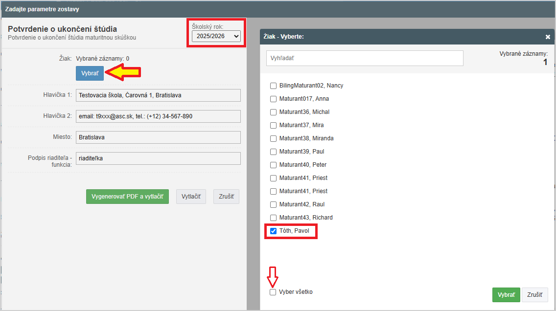 V ponuke tlačovej zostavy v ľavej časti nechajte vybratý aktuálny školský rok.