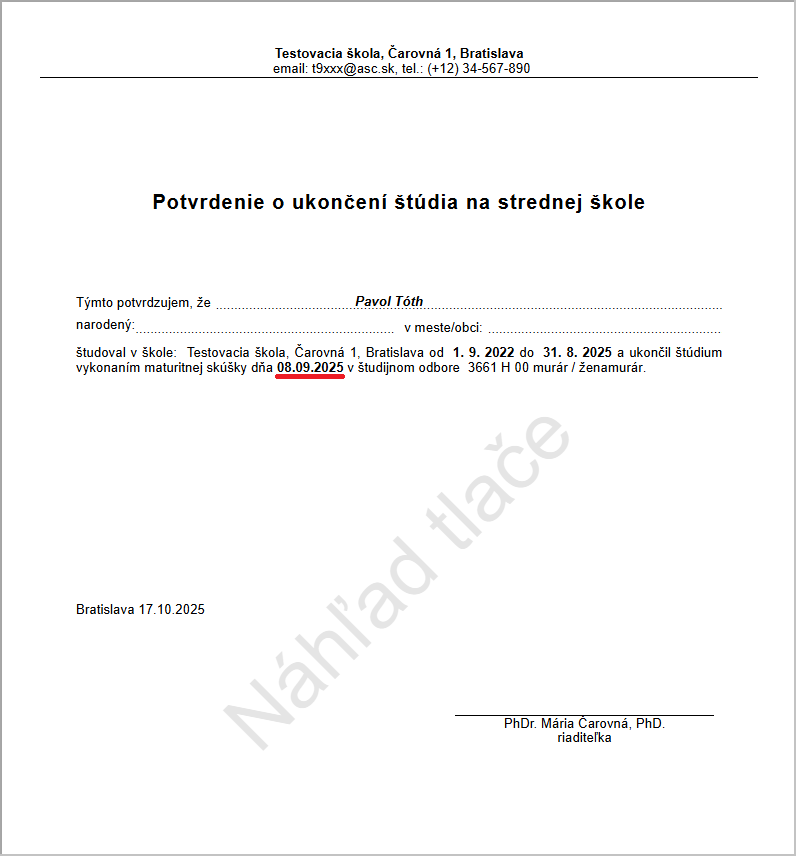 Ako vytlačím potvrdenie o ukončení štúdia na SŠ maturitnou alebo záverečnou skúškou?