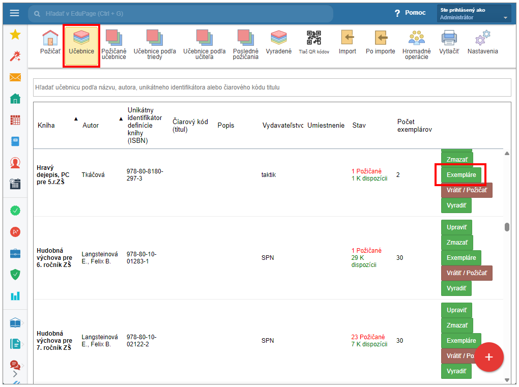 V hornom menu vyberte "Učebnice" a v zozname titulov, pri danom titule kliknite na "Exempláre".