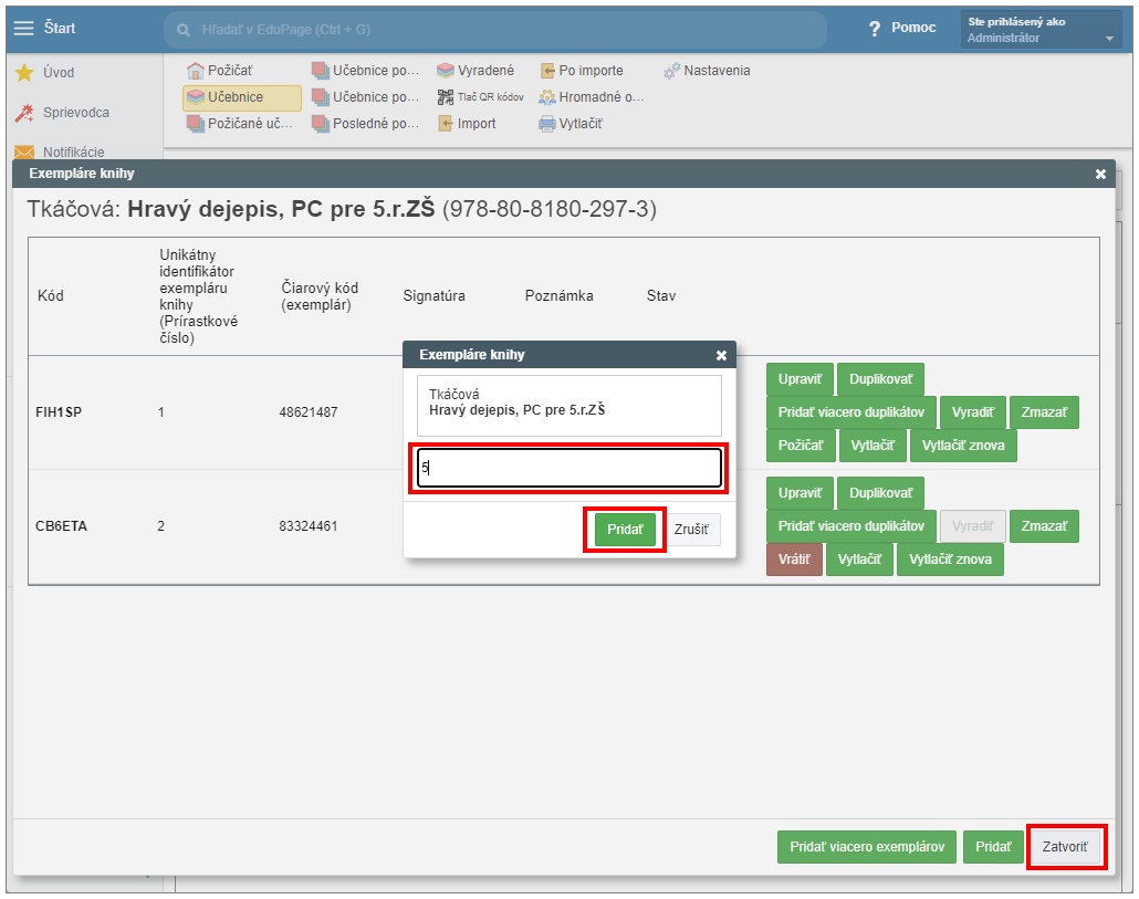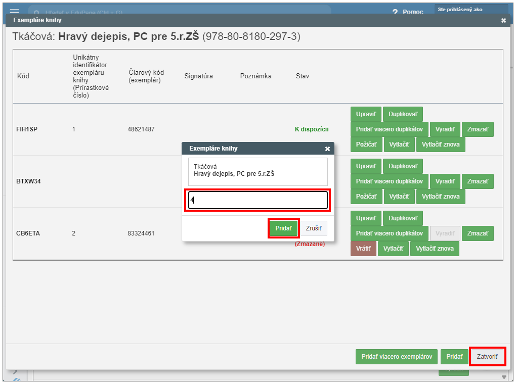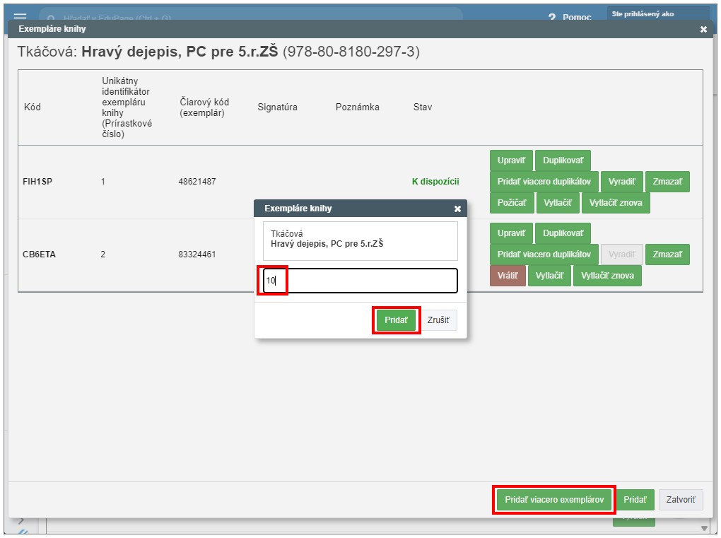 Ak si želáte vytvoriť viac exemplárov učebníc s rovnakými údajmi ako má už existujúci exemplár, potom v riadku vybraného exempláru stlačte tlačidlo "Pridať viacero duplikátov".