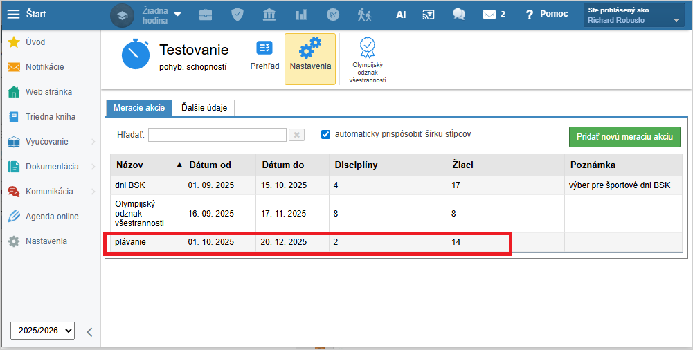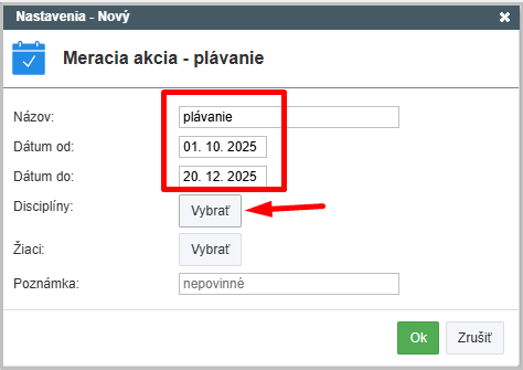 V prostredí administrácie modulu môžete vytvoriť meraciu akciu pre zvolené disciplíny. Učiteľom to uľahčí výber žiakov pri zapisovaní výsledkov.