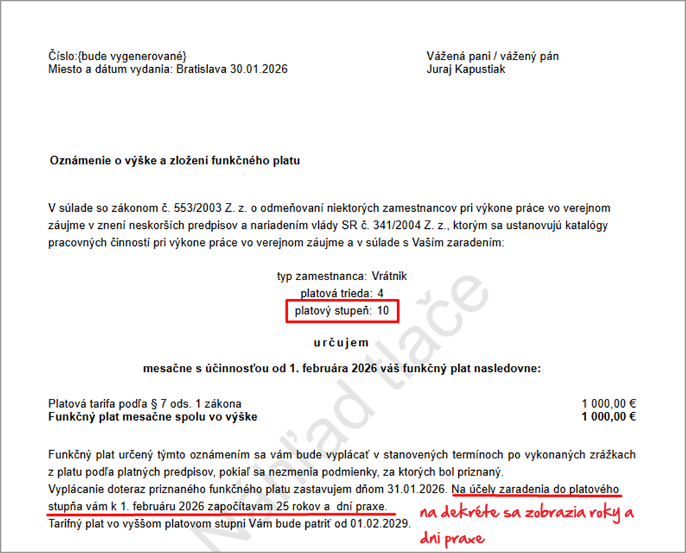 Vtedy nie je potrebné uvádzať roky započítanej praxe, na dekrét sa iba uvedie platový stupeň.