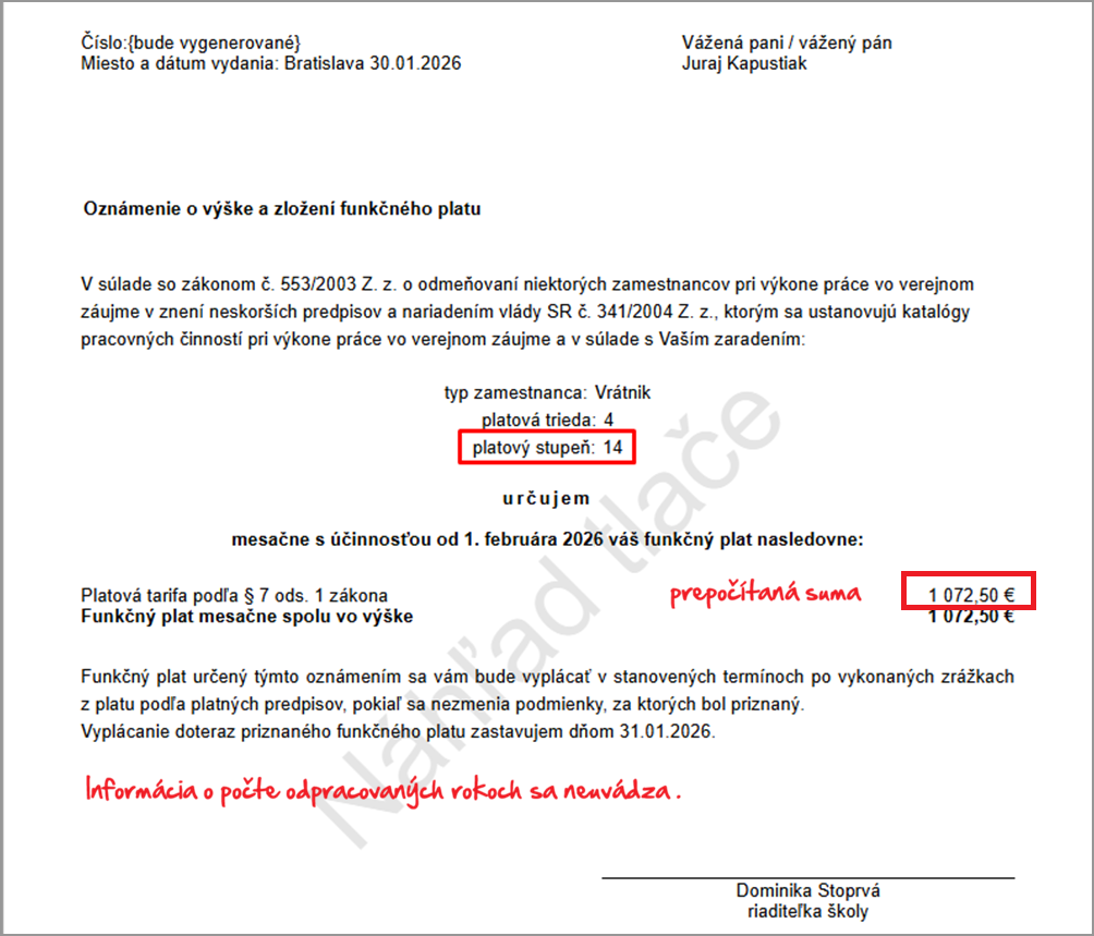 Na vygenerovanom platovom dekréte je uvedená prepočítaná suma; informácia o odpracovaných rokoch sa nezobrazuje.