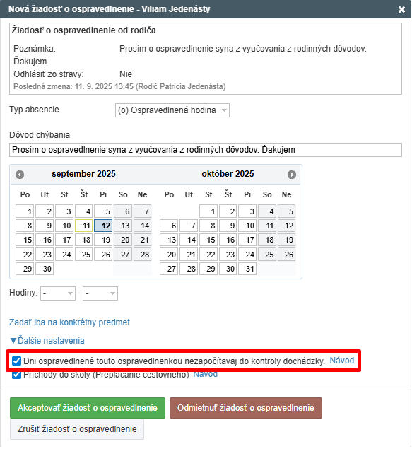 Triedny učiteľ môže ktorúkoľvek zo žiakových ospravedlneniek označiť "nezapočítavať do kontroly maximálne 5/7 dní". EduPage následne tieto dni nebude rátať do kontroly a oranžový otáznik zmizne.