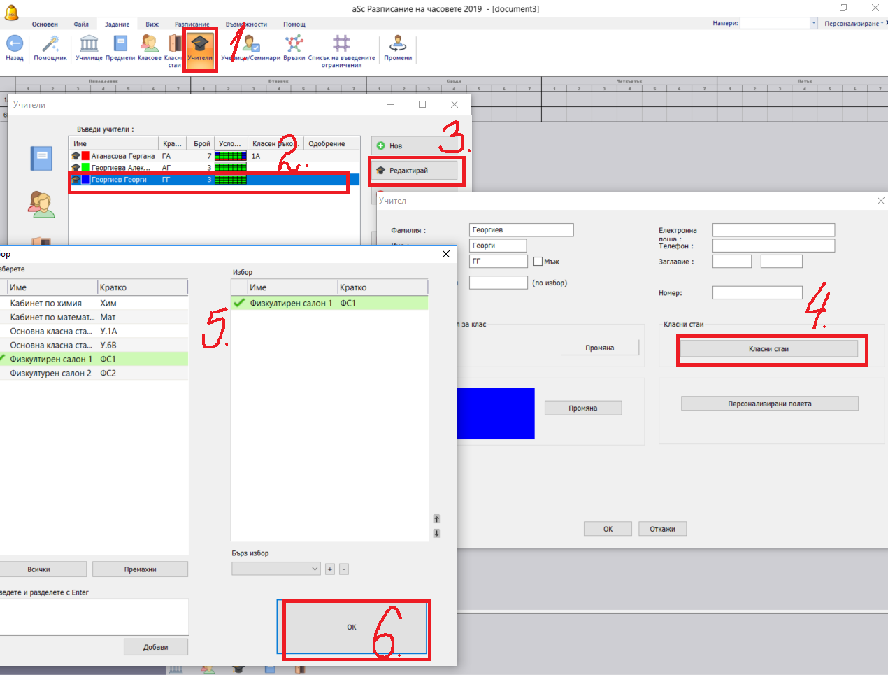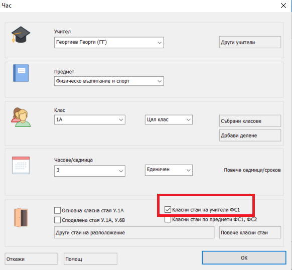 Забележка: Ако учебният предмет има свои класни стаи, тогава това е приоритет и по подразбиране класните стаи на учителя не се вземат под внимание.