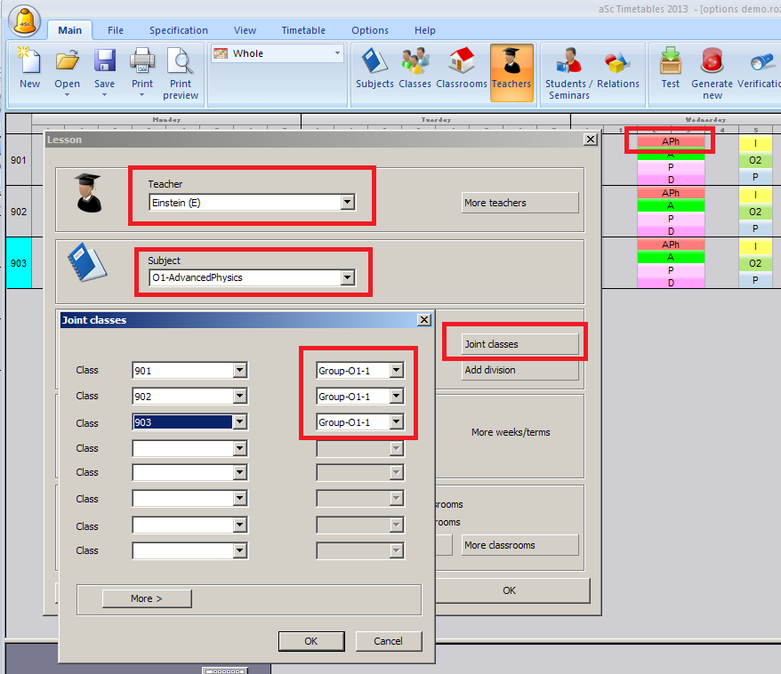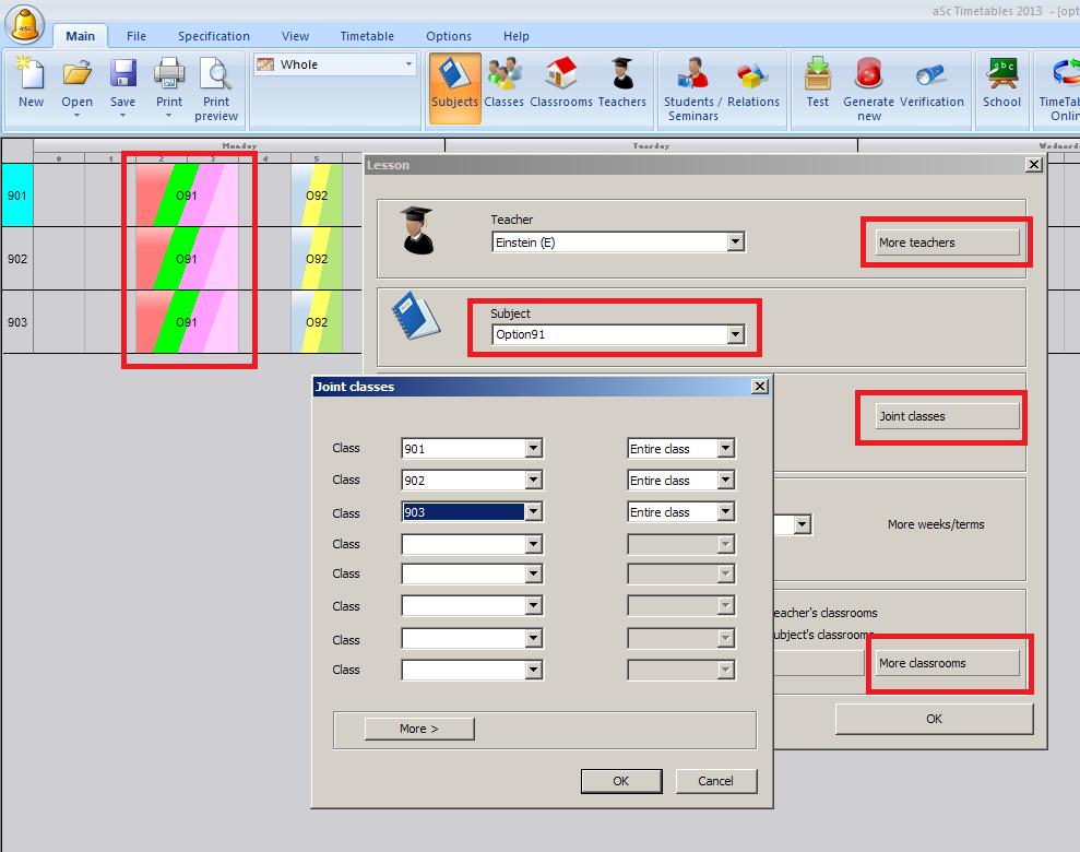 Най-бързият начин да се реши това е като се създадат учебни предмети с имена „Опция 1“ и „Опция 2“. След това създайте дълги часове с всички учители, които преподават учебните предмети от Опция 1 и слейте всички три класа. Използвайте бутон „Повече учители“ и „Събрани класове“: