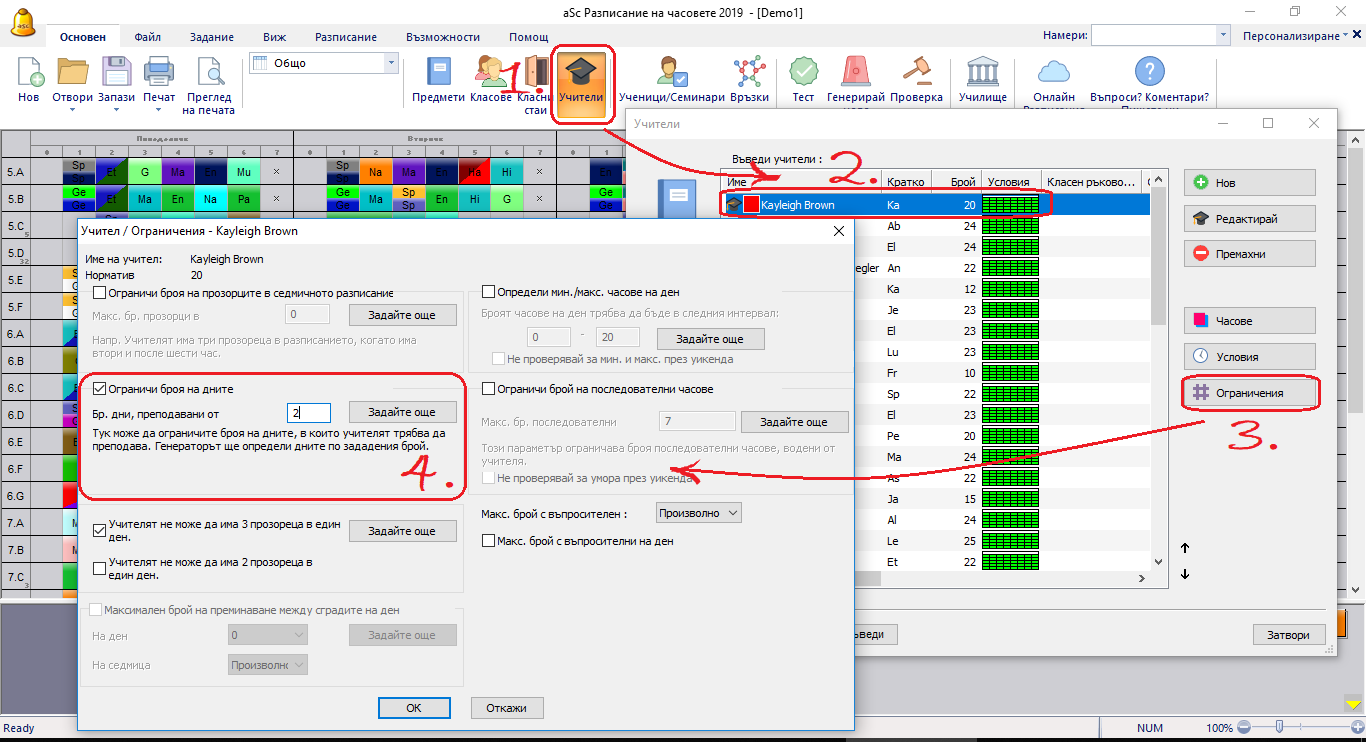 Забележка: Ако обозначите дните точно, внимавайте да не обозначите по сходен начин други учители. Може да се случи така, че всички външни учители желаят да преподават във вторник и четвъртък. Такива изисквания може да се окаже невъзможно да се изпълнят.