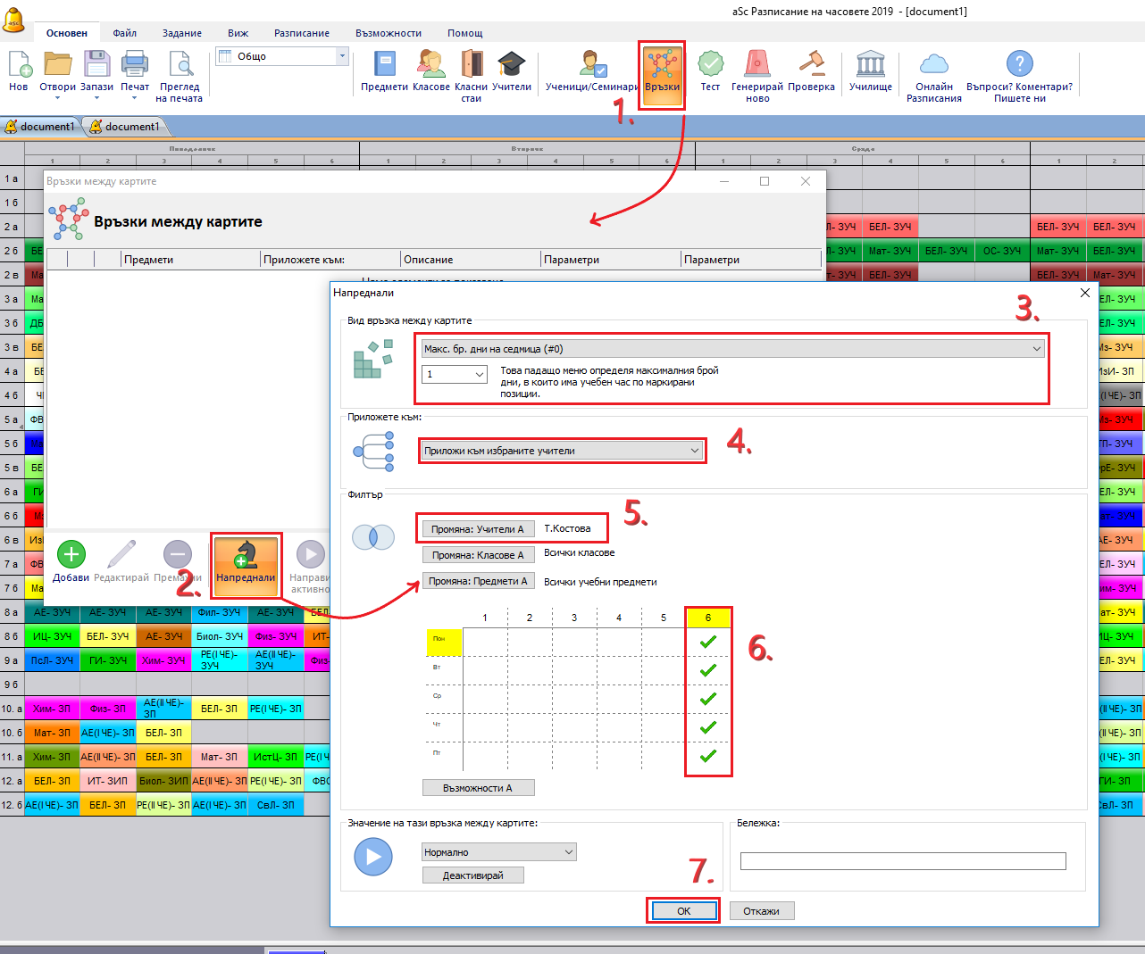 Например, можете да кажете, че 5, 6 и 7 час са под въпрос и учителят може да има максимум 2 часа всеки ден. Тогава можете да сте сигурни, че учителят има най-малко един свободен час за обедна почивка всеки ден.
