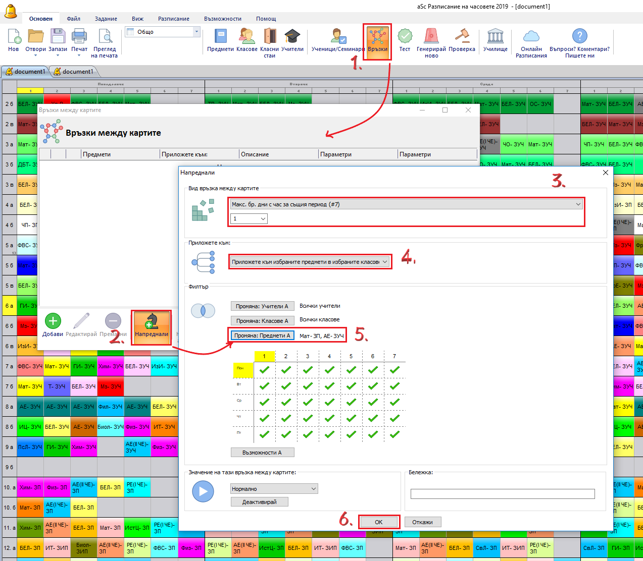 Горната екранна симка в действителност показва два учебни предмета в тази връзка в картата. Но тъй като сме обозначили "Приложи към избраните учебни предмети в избраните класове", тогава всеки предмет се третира отделно във всеки клас. Така, че трябва да определите една връзка в картата да информира, че трябва да има само един час по Математика и само един час по Английски език за всяко учебно време през седмицата.