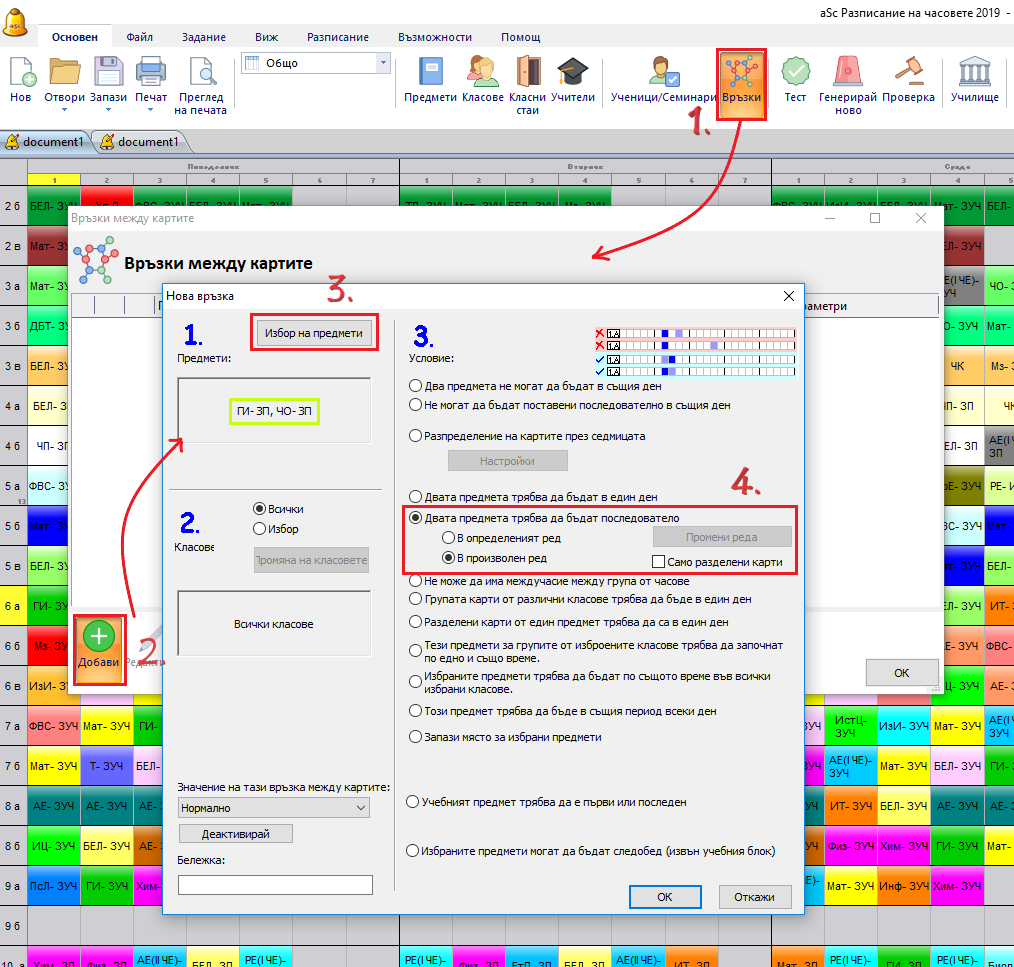 Можете да създадете една връзка в картата, която определя, че два учебни предмета трябва да следват един след друг (в произволен или определен ред/последователност):