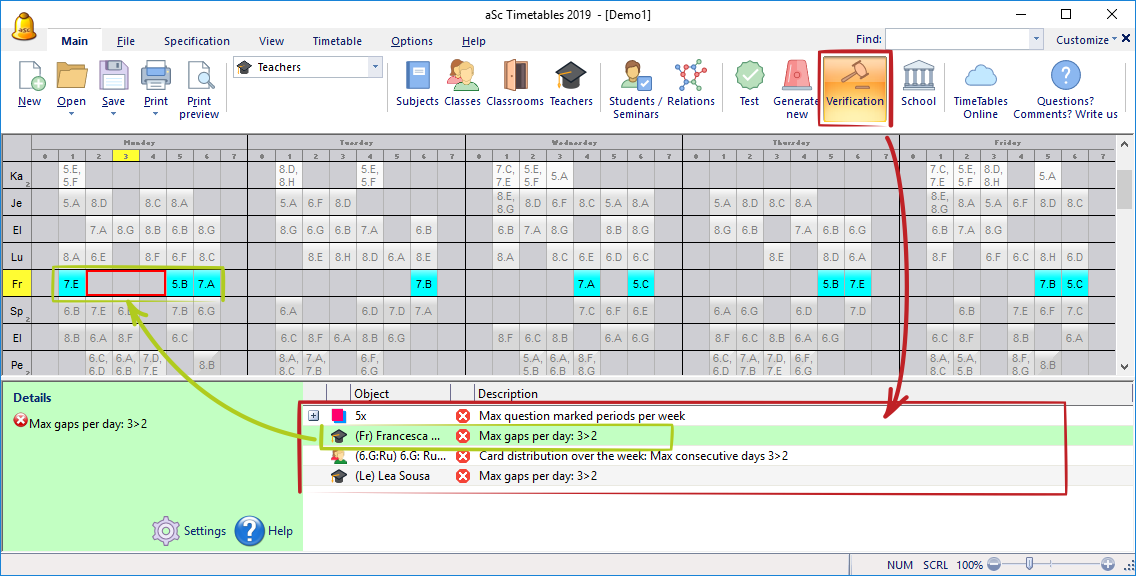 Програмата aScTimeTables позволява да проверите създаденото разписание. Можете да стартирате верификация от менюто – Основен/ Проверка (или чрез натискане на "Интервал" (Space)). Показват се нарушените или освободени ограничения в текущо разписание.
