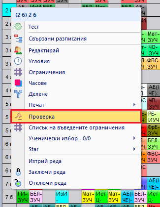 Ако искате да видите проблемите само на един клас или само на учители в текущото разписание, можете да кликнете с десен бутон на мишката върху реда с наименованието на класа/учителя и да изберете "Проверка".