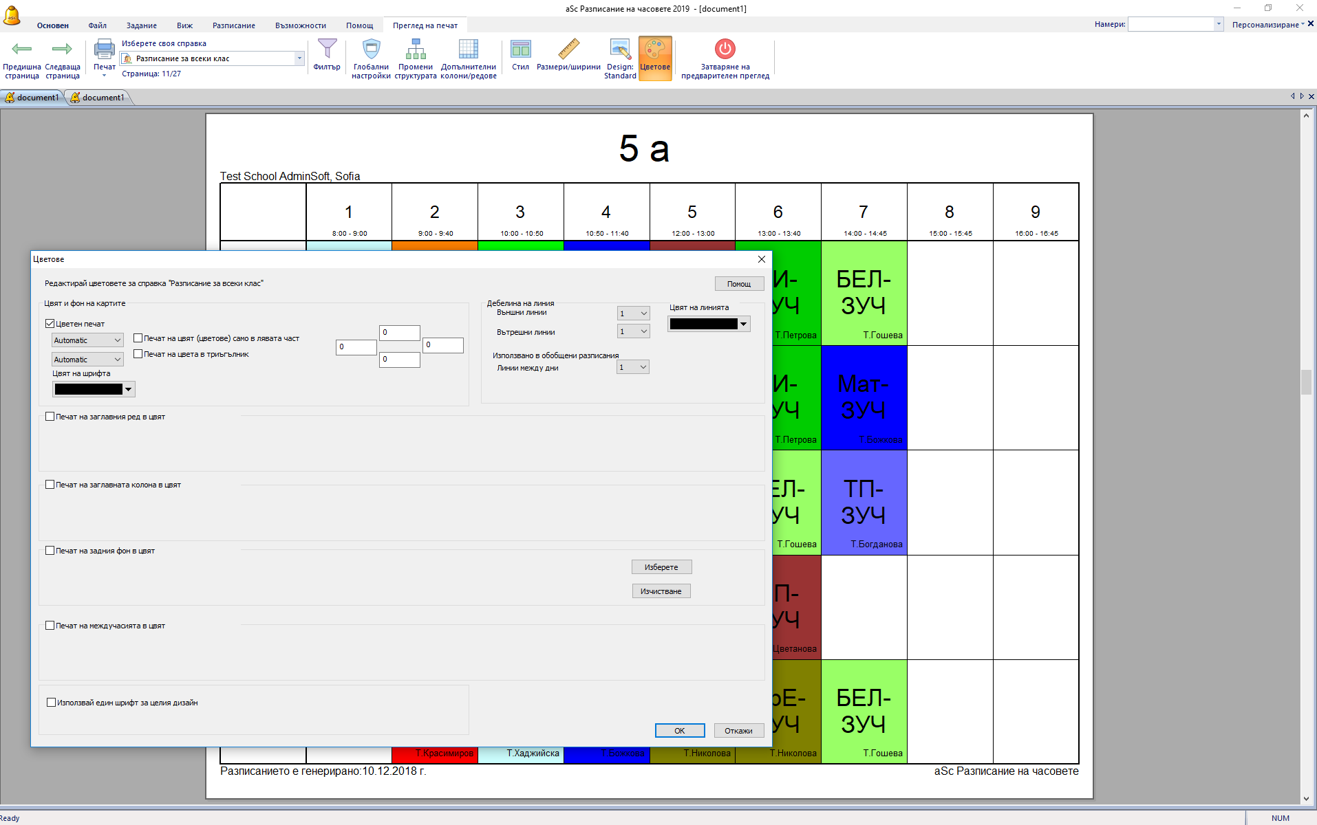 Ако обозначите, например Учител, цветът на основа на всяка карта ще се определя от часовете на учителя. Това се отнася само за избрани разпечатки. Тази характеристика е полезна, например, ако искате да принтирате разписанието за учителите и го оцветите на база сгради, за да виждате кога учителите е нужно да се прехвърлят/сменят сгради.