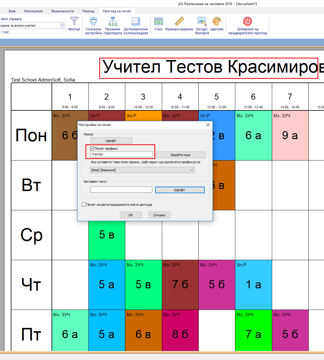 По подразбиране обобщеното разписание на учителите се принтира като се използват цветовете за класовете.